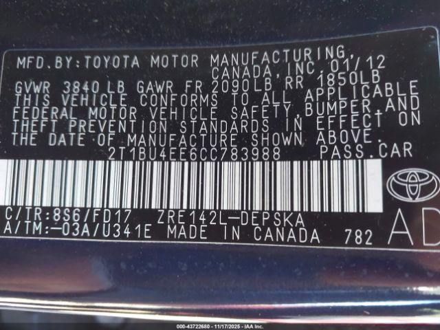 | VIN : 2T1BU4EE6CC783988 |