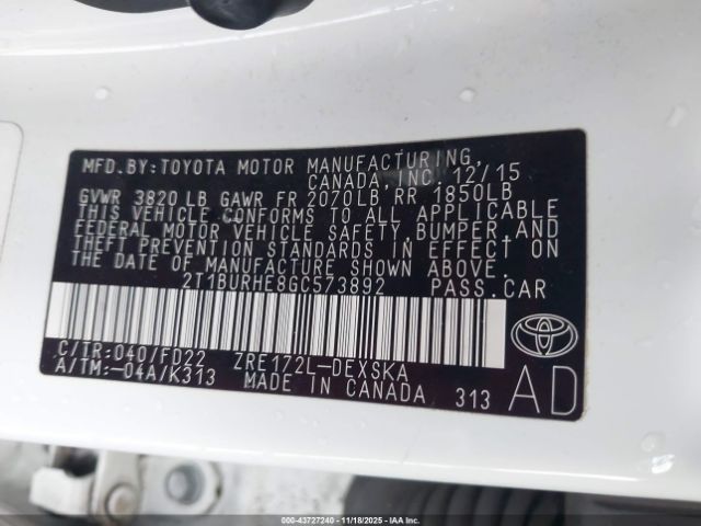 | VIN : 2T1BURHE8GC573892 |