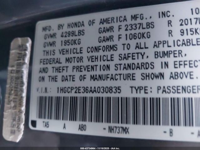 | VIN : 1HGCP2E36AA030835 |