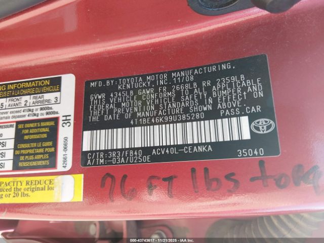 | VIN : 4T1BE46K99U385280 |