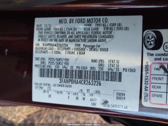 | VIN : 3FAHP0HA4CR263226 |