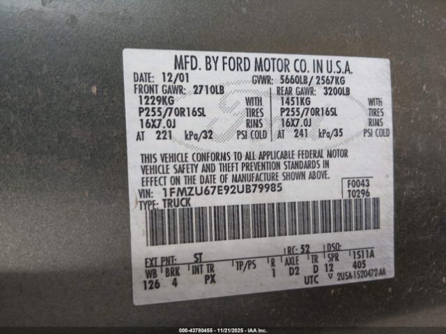 | VIN : 1FMZU67E92UB79985 |