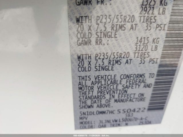 | VIN : 5N1DL0MM7HC550422 |