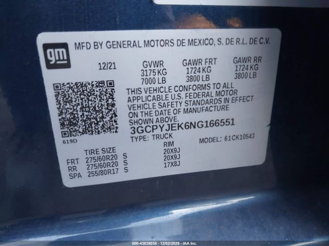 | VIN : 3GCPYJEK6NG166551 |