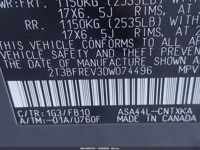 | VIN : 2T3BFREV3DW074496 |